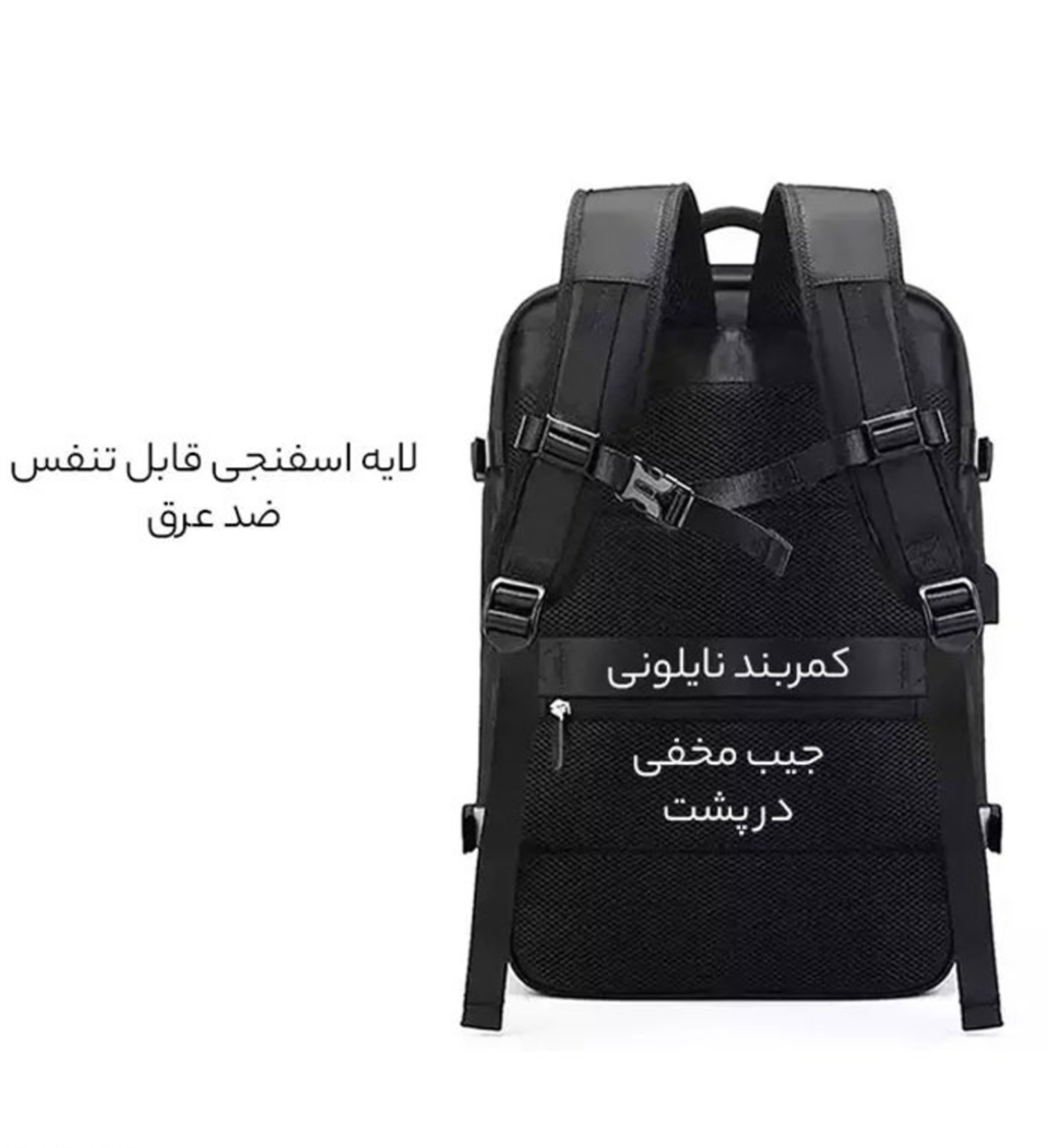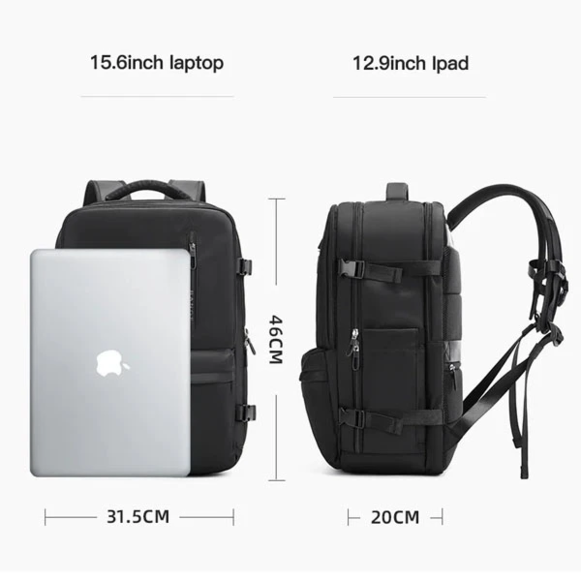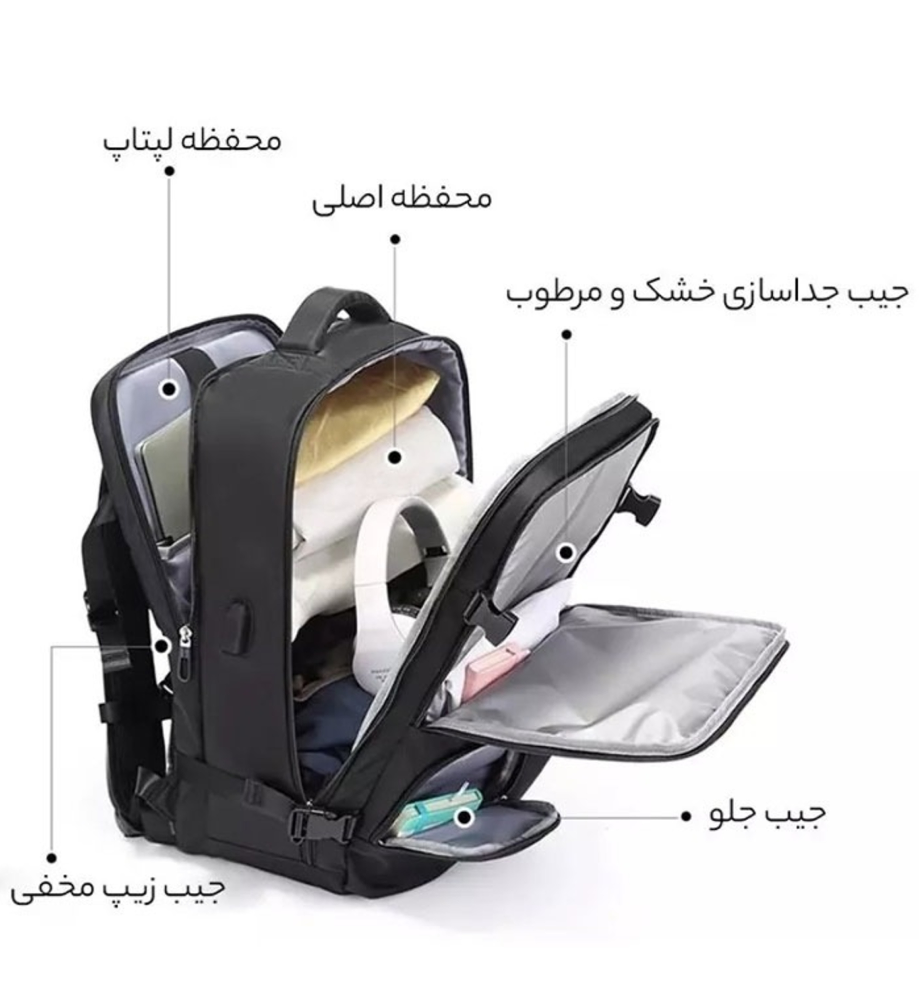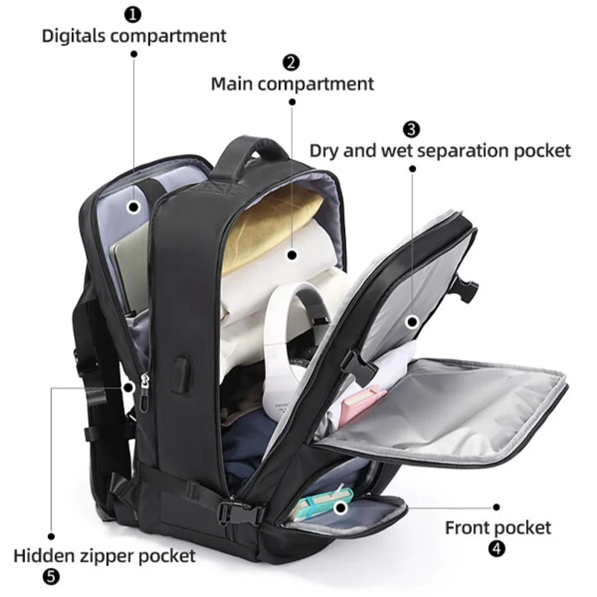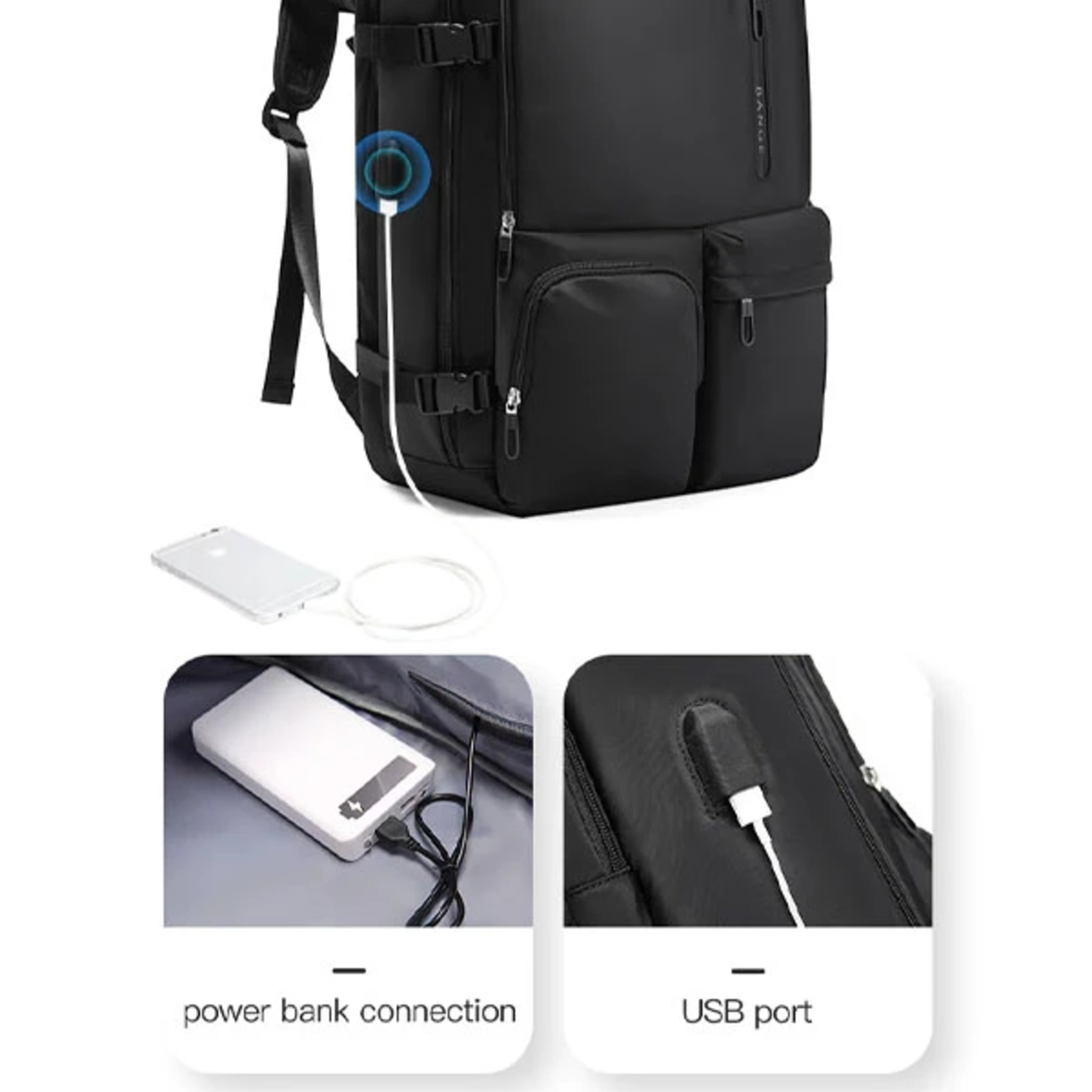 پارچه ضد آب دارای درگاه USB جداشونده دارای جیبهای داخلی جداگانه دارای بند شانهای قابل تنظیم.کوله پشتی ضد آب دارای محفظه جداگانه برای نگهداری لپتاپ بوده، کوله پشتی به شما این امکان را می دهد تا بتوانید به راحتی لوازم آرایشی و بهداشتی،تلفن همراه، کتاب و لباس خود را داخل محفظه بزرگ آن قرار دهید، قسمت داخلی محفظه اصلی کوله دارای جیب های داخلی بوده که گزینه مناسبی برای نظم دادن به وسایل داخل کوله است.