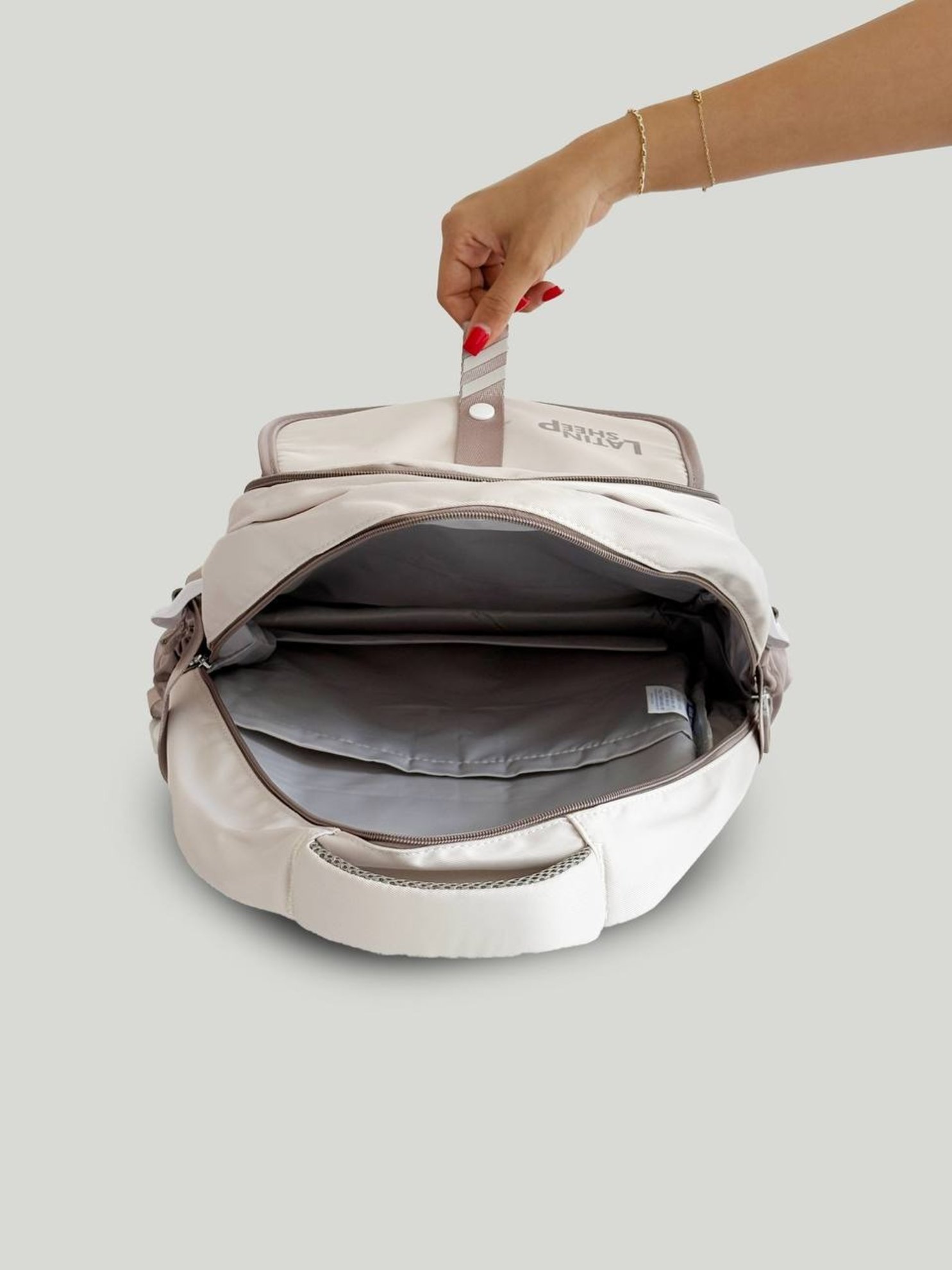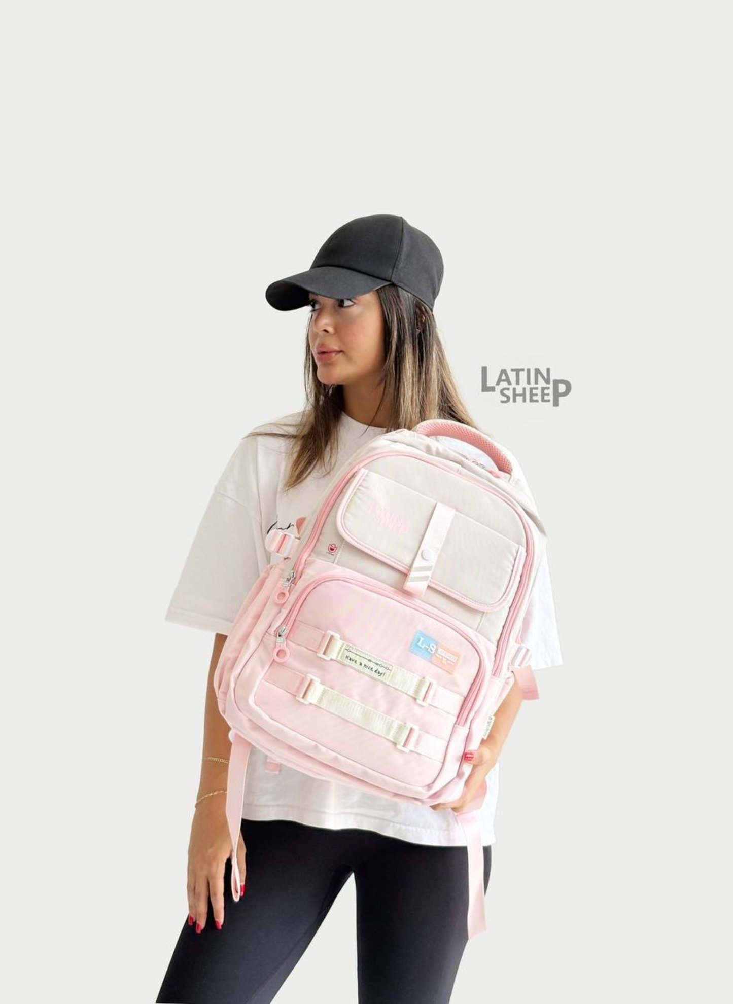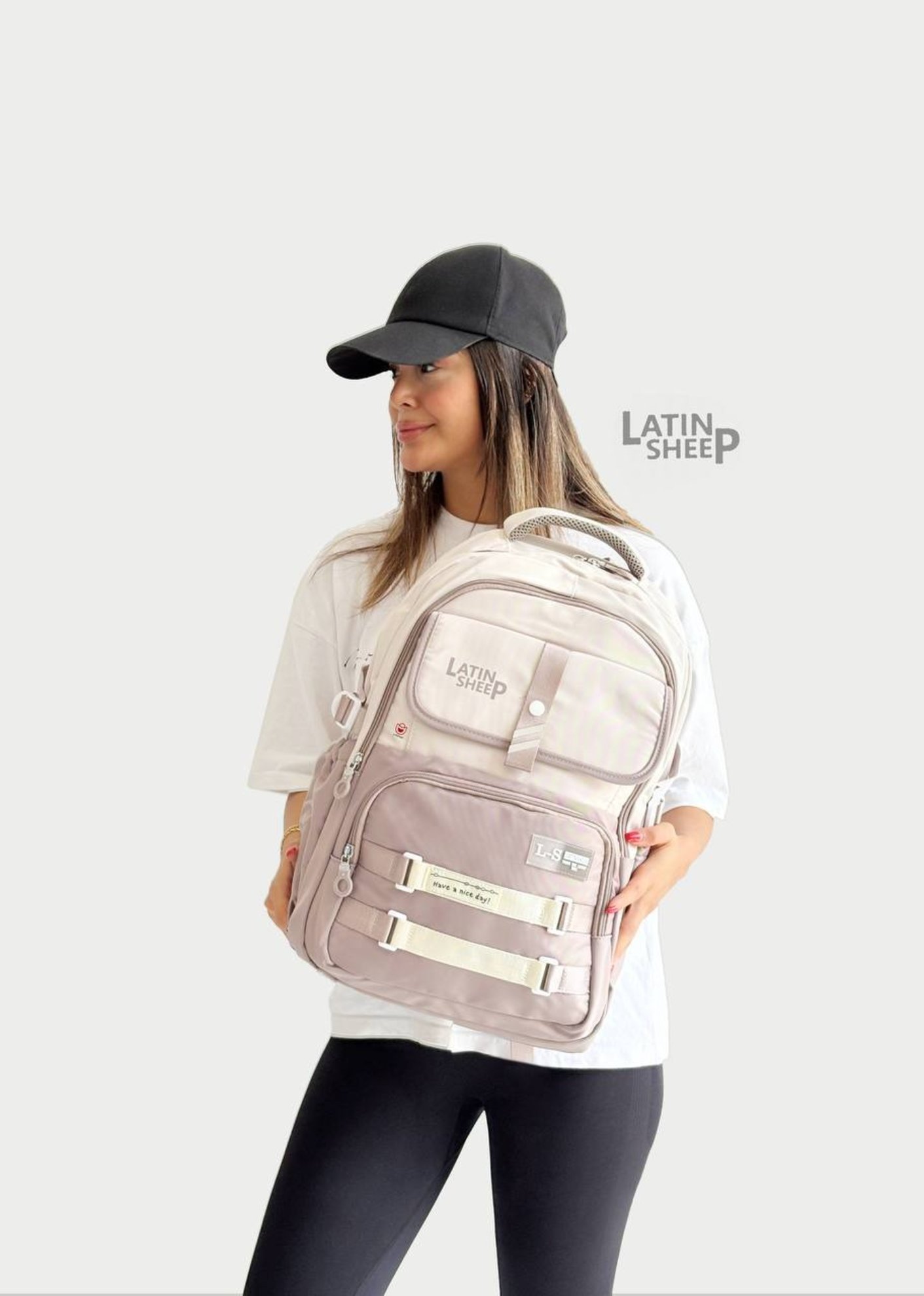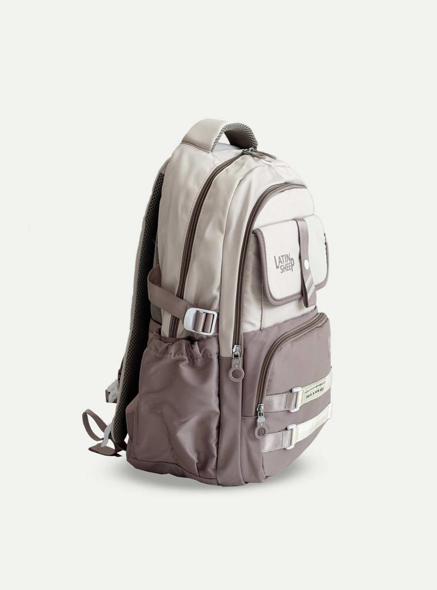 دارای یک قسمت اصلی که دارای قسمت بندی هست و دو جیب زیپ دار یک جیب چسبی و یک جیب در قسمت پشتی کوله دو جیب قمقمه ای
